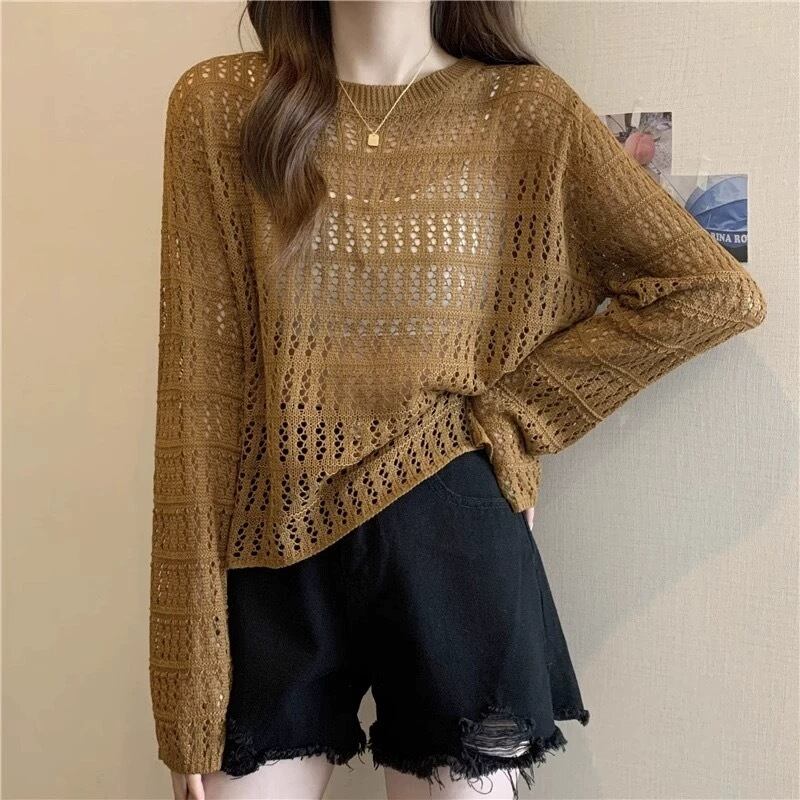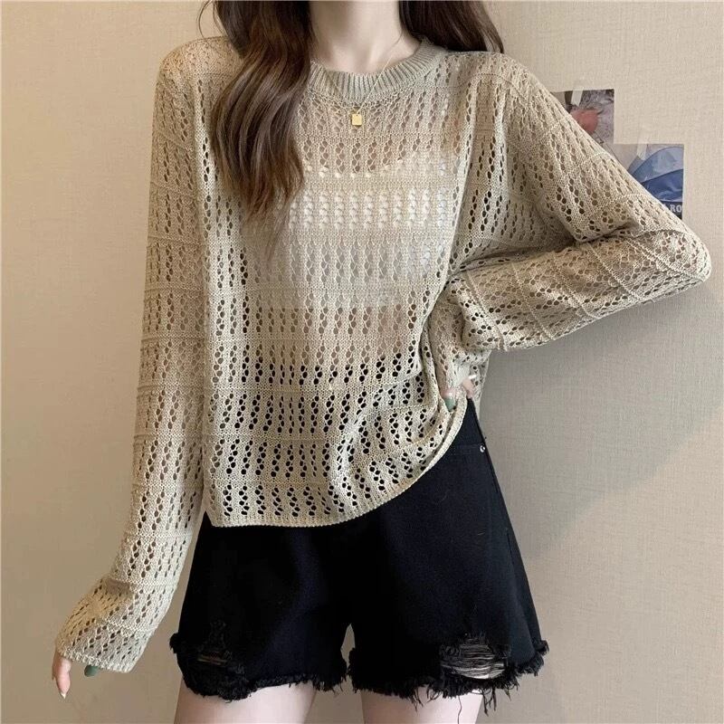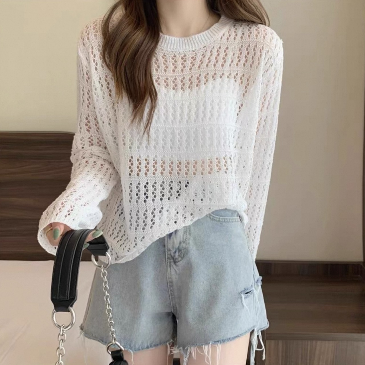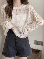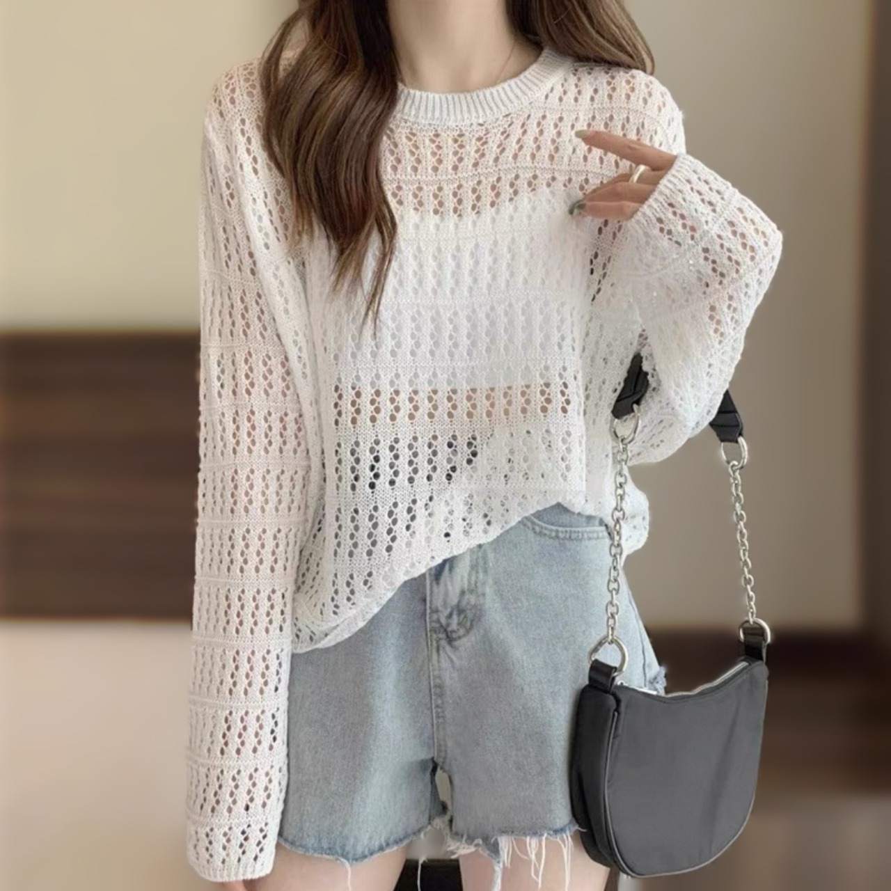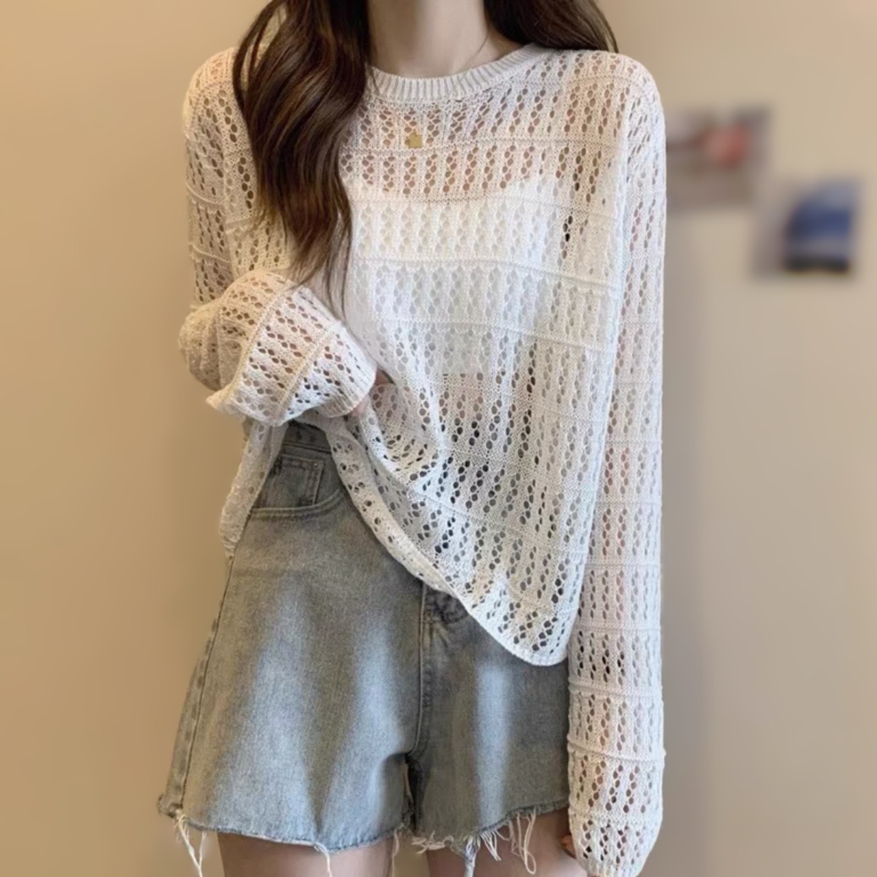 透かし編みのデザインが、レイヤードコーデにぴったりの一枚
