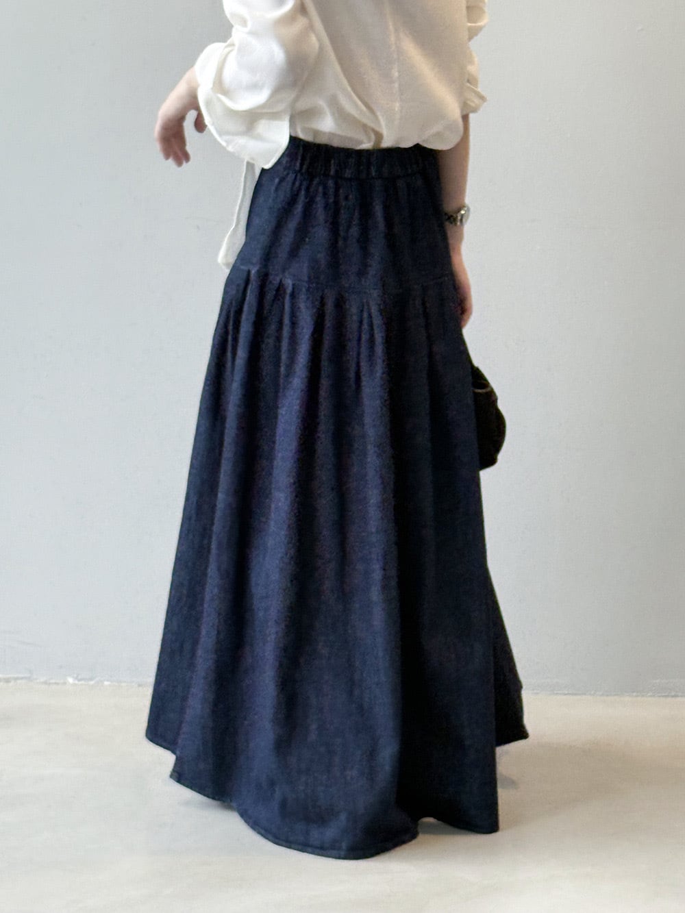 【 エレガントで可愛いデザイン 】  バルーンシルエットが特徴のロングスカートです。程よいふんわり感があり、可愛らしさと女性らしさを演出します。デニム素材で、カジュアルにも上品にもコーディネート可能です。
