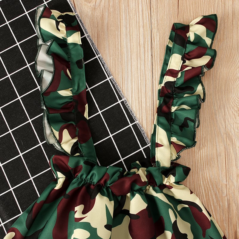 こちらのセットアップは、存在感のある迷彩柄が魅力です。サスペンダー付きのスカートとTシャツの組み合わせで、カジュアルながらもお洒落に決まります。軍服としての独自性が際立ち、注目を集めること間違いなし!