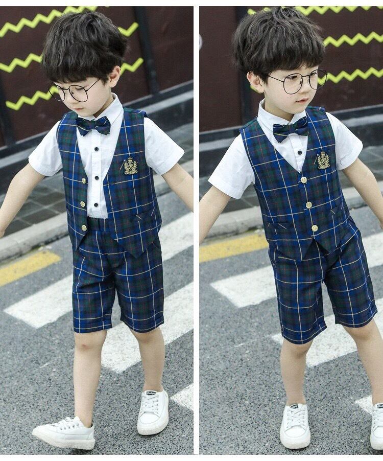 送料無料 フォーマルスーツ 男の子 スーツ キッズ 子供 チェック 半袖 入学式スーツ 4点セット 上下セット ベスト蝶々ネクタイ付 タキシード 夏 入学式 入園式 卒業式 七五三 結婚式 発表会 | primarc