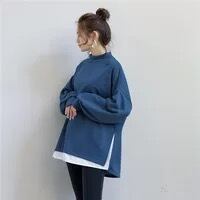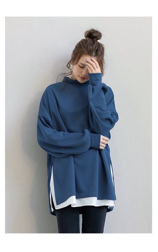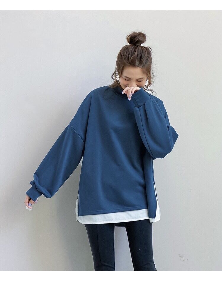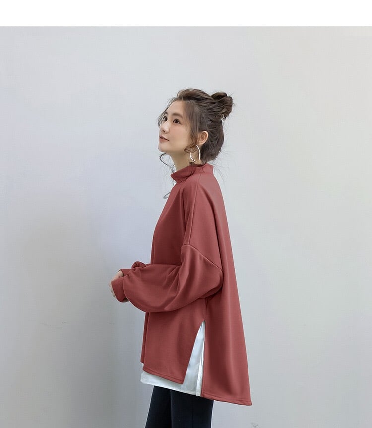 ビッグシルエットなサイズ感の重ね着風のハイネックトレーナー。