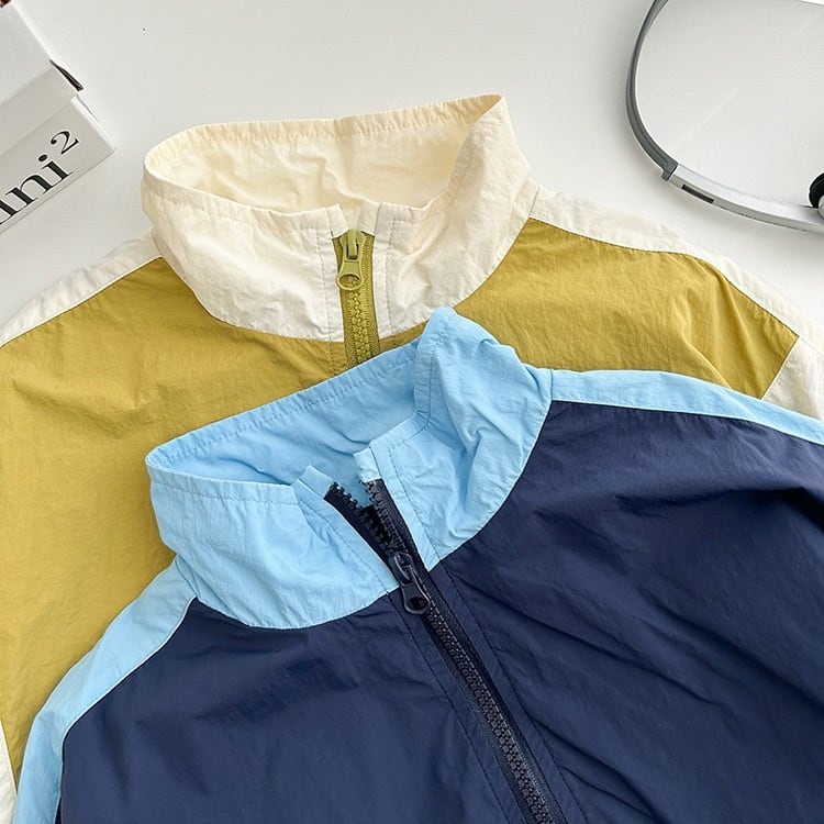 春から秋まで大活躍するアウトドアテイストナイロンジャケット。スポーティーカジュアルなデザインで普段着、アウトドアシーズンのお出かけに、様々なシチェーションで使い勝手のいいジャケットです。上下で切り替えられたバイカラーデザインは男の子、女の子も着られます。お目立ち間違い無しのジャケットです。