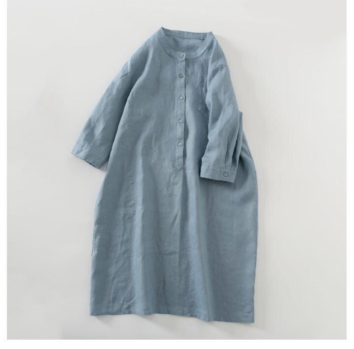 「上質麻のシャツワンピース」は、大人の女性にぴったりなシンプルながらも上品なデザインが特徴です。スタンドカラーとオープンシャツのデザインで、大人っぽく余裕のある印象を与えます。五分袖で袖口はギャザー仕様なので、手首周りがすっきり見え、ほっそり効果も期待できます。長めの丈感は、体型カバーにも最適です。リネン素材の質感が涼しげで、夏場のお出かけにぴったり。また、薄手で通気性が良く、快適に着用できます。