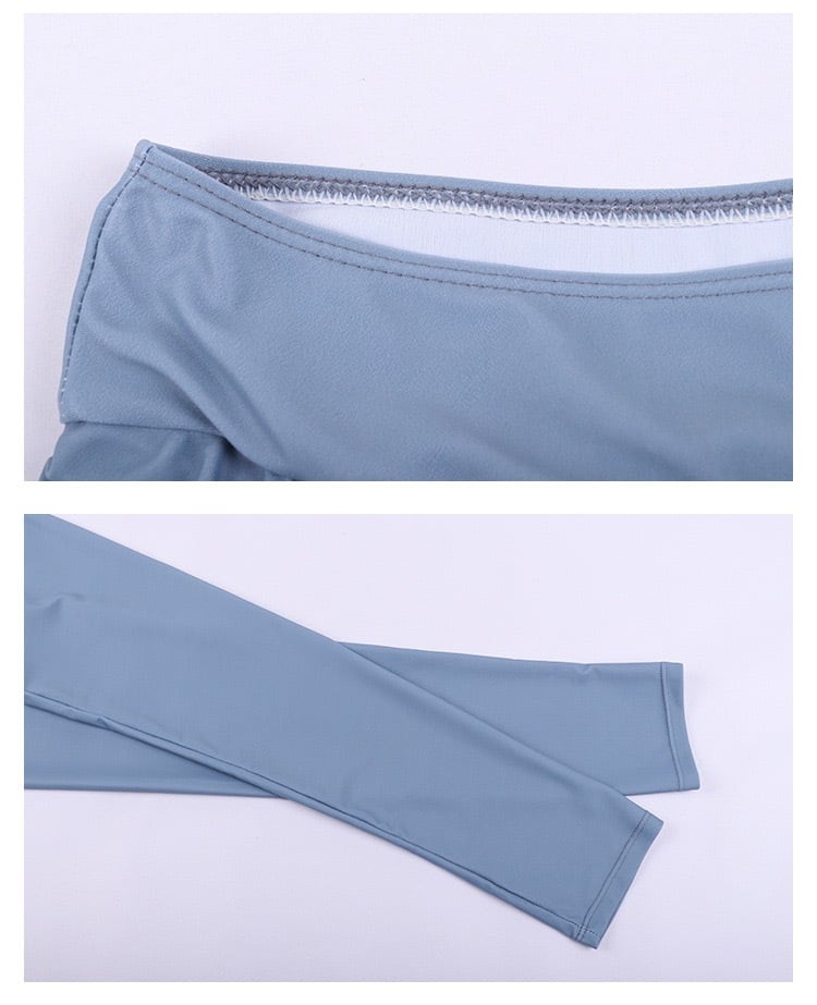 ストレスフリーなノンワイヤーなのでアクティブなシーンでも動きやすく快適です。レギンスも付いているので、足先まで日焼け防止&怪我防止の効果も!