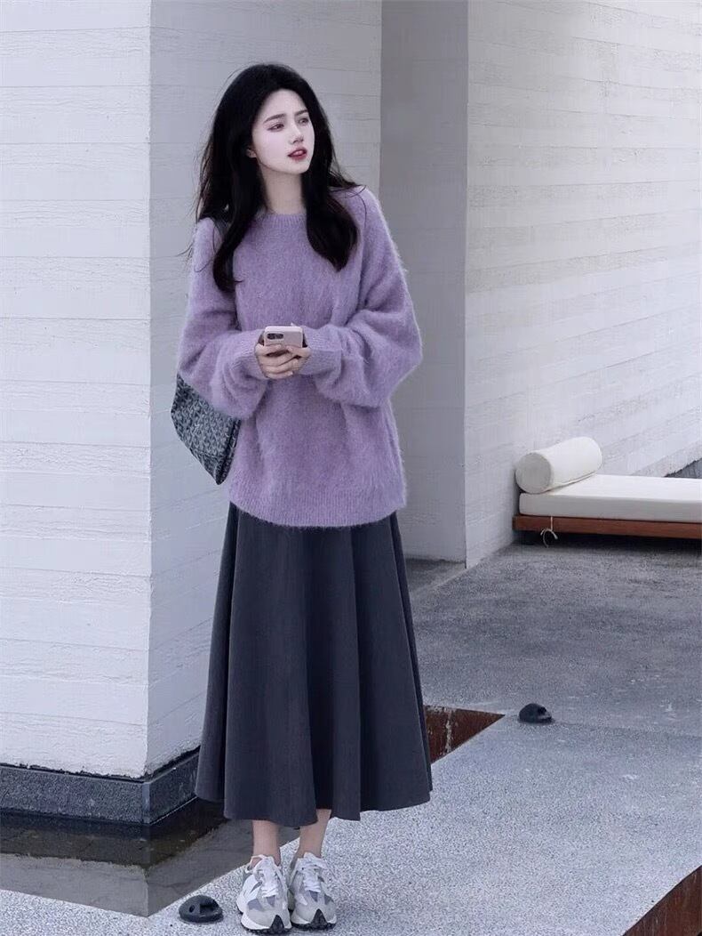 きちんと感のある太めリブニットで、力の抜いたこなれ感を醸します。