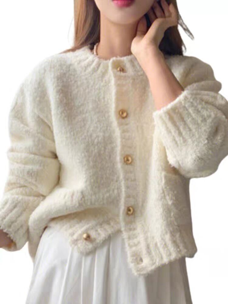 ゴールドボタンとモコモコ感が可愛いニットカーディガン