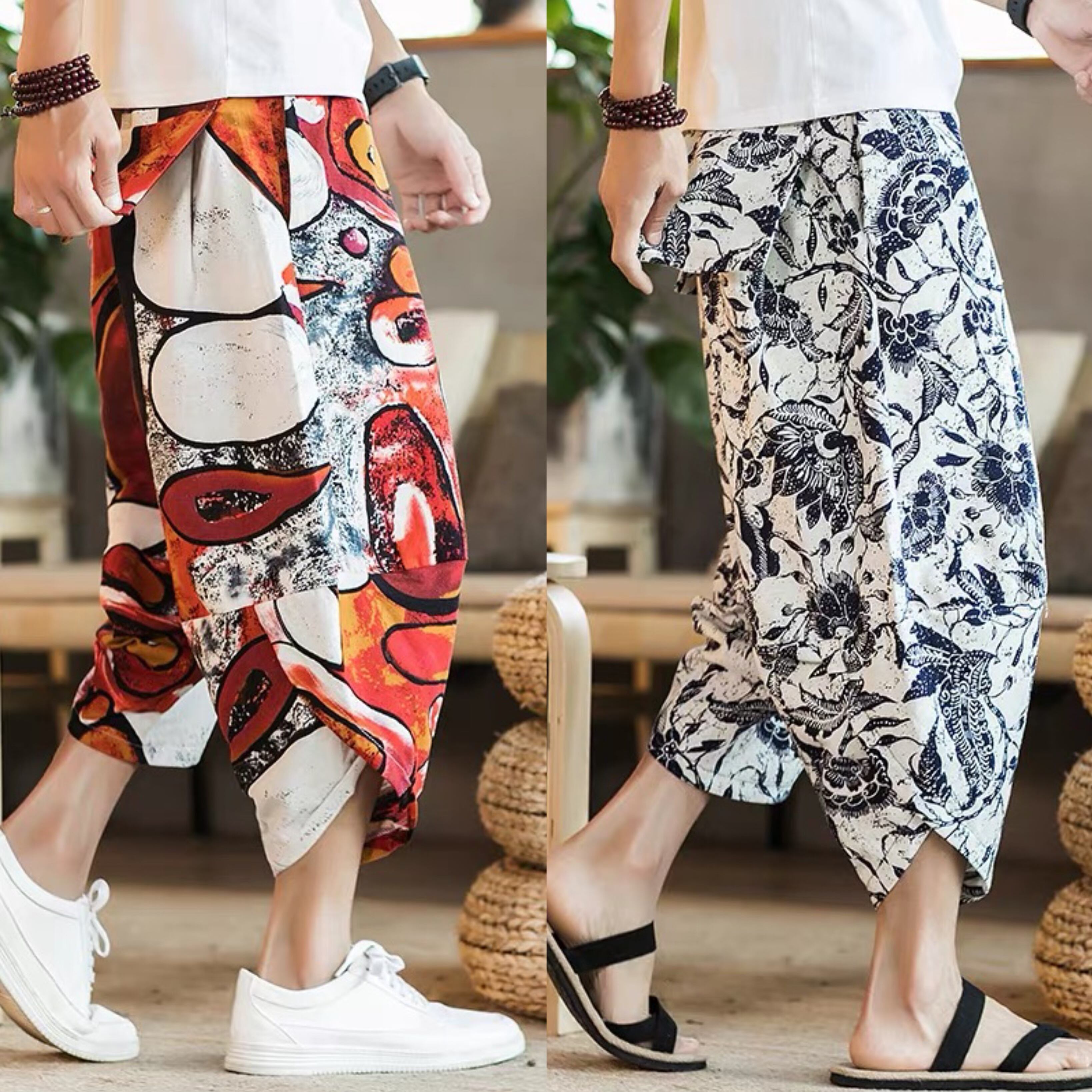 送料無料 サルエルパンツ メンズ 麻 イージパンツ 7分丈 リネンパンツ ワイドパンツ クロップドパンツ ボトムス 大きいサイズ リラックス ズボン オシャレ コーデ 涼しい 春 夏 秋 海 旅行 ビーチ ネイビー 黒 総柄 リゾート ゆったり 敬老の日 父の日 | primarc