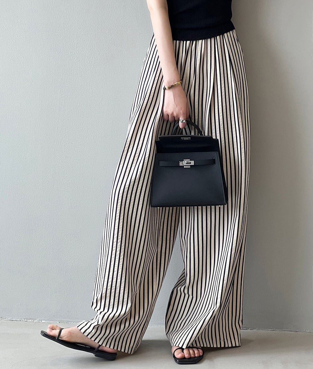 縦のストライプ柄が涼しげなワイドパンツ。ウエスト部分にはゴムが入っているので、楽ちんな穿き心地が魅力です。裾に向かって広がるラインが足長効果を演出し、スタイルアップも叶います。春夏のお出かけやリゾートシーンにもぴったりな1本です。
