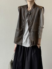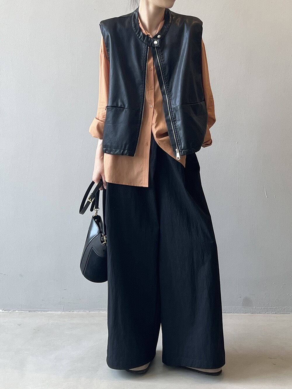 シンプルで使いやすいデザインながらも、フェイクレザー素材が高級感を演出してくれます。ノースリーブなので、秋のコーディネートに最適。韓国ファッションを彷彿させるおしゃれなデザインで、トレンド感も抜群です。